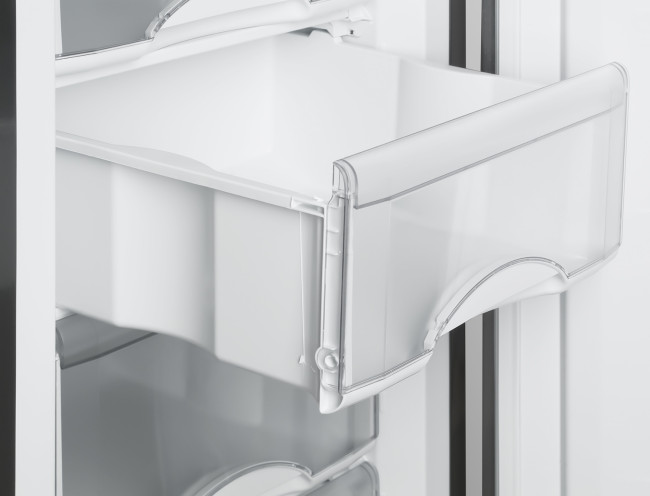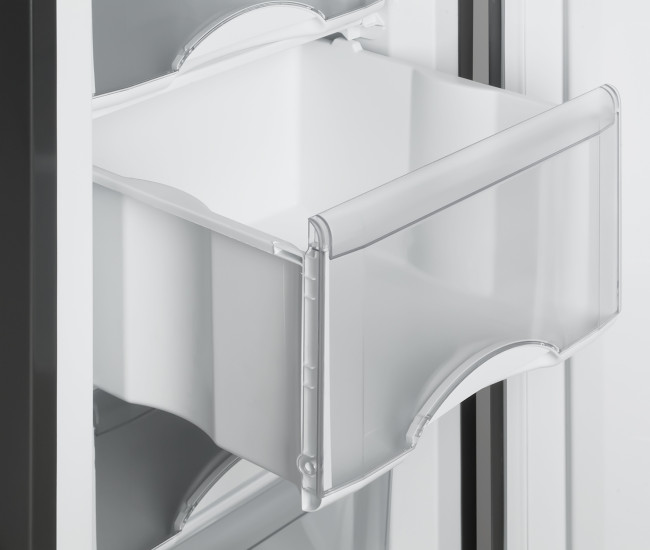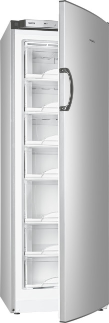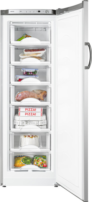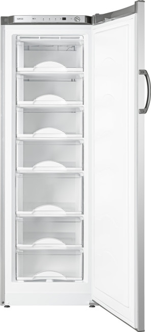 морозильник на 7 отделений, цвет СЕРЕБРИСТЫЙ (габариты 1768х595х625 мм), все корзины пластиковые белые, все полностью выдвигаются, лицевые панели корзин прозрачные, класс энергоэффективности А+, механическое управление температурой (терморегулятор с делениями)
