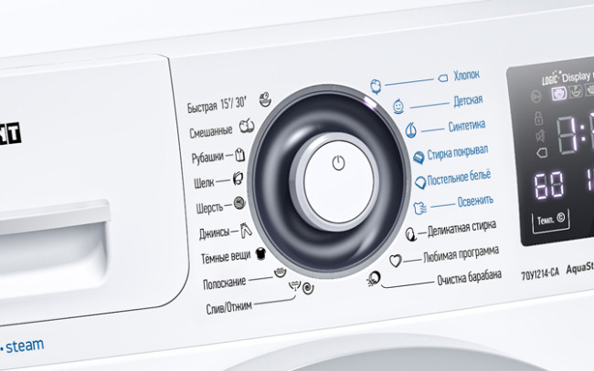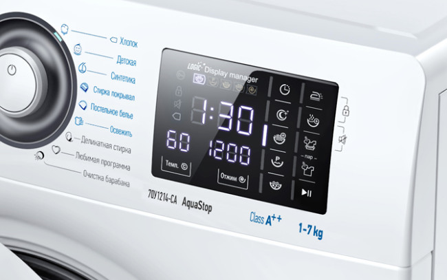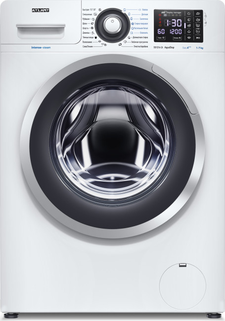 автоматическая стиральная машина с фронтальной загрузкой и электронным управлением, загрузка белья 7 кг, 1200 оборотов при отжиме, технология обработки паром, уменьшенный размер, система защиты от протечек AQUA-STOP
