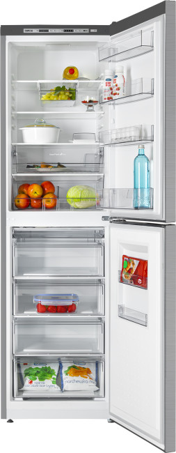 двухкамерный двухкомпрессорный холодильник с нижним расположением морозильной камеры цвета НЕРЖАВЕЮЩАЯ СТАЛЬ (габариты 2068х595х627 мм) с 4 отделениями в морозильной камере, дизайн "ADVANCE", класс энергоэффективности А+, электронное регулирование температуры, LED-освещение, антибактериальная защита