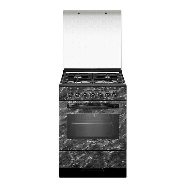 широкая газоэлектрическая плита черного цвета с рисунком "мрамор" обновленного дизайна со стеклянным фасадом и стеклянной крышкой (габариты 60х60х85 см), оснащенная электророзжигом (встроен в ручки) и газконтролем горелок стола, электромеханическим таймером, ТЭН-грилем, термостатом, вертелом с электроприводом, двойной подсветкой духовки, выдвижным ящиком, регулировочными ножками и проволочными направляющими духовкиЦвет: черный с рисунком "мрамор". Варочная поверхность: эмалированная.