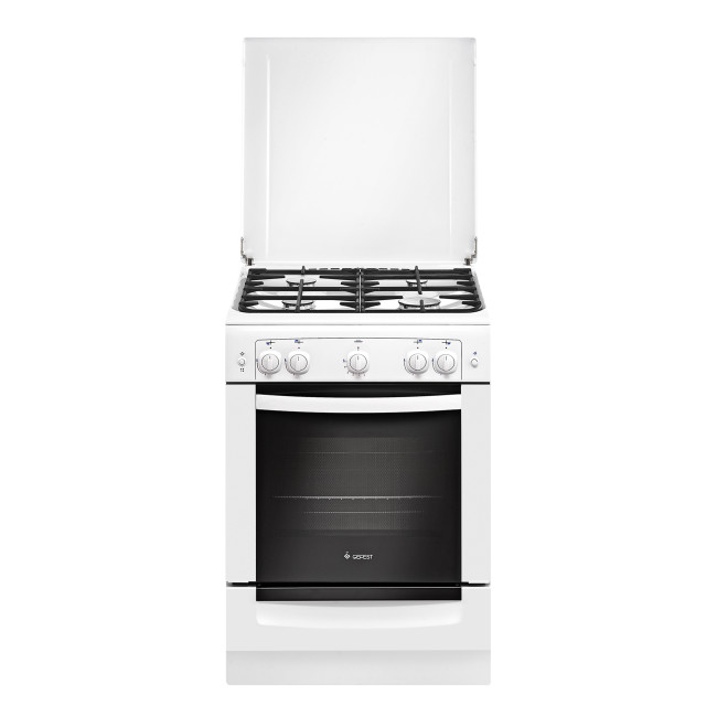 широкая газовая плита белого цвета обновленного дизайна с эмалированным фасадом (габариты 60х60х85 см), оснащенная газ-контролем горелок стола и духовки, электророзжигом горелок стола, подсветкой духовки, выдвижным ящиком и регулировочными ножкамиБелый эмалированный фасад