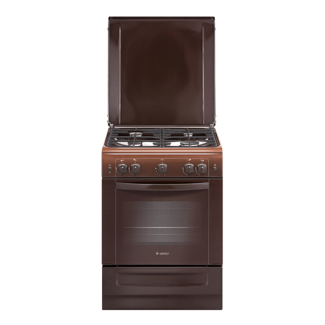 широкая газовая плита коричневого цвета обновленного дизайна с эмалированным фасадом (габариты 60х60х85 см), оснащенная газ-контролем горелок стола и духовки, электророзжигом горелок стола, подсветкой духовки, выдвижным ящиком и регулировочными ножкамиКоричневый эмалированный фасад